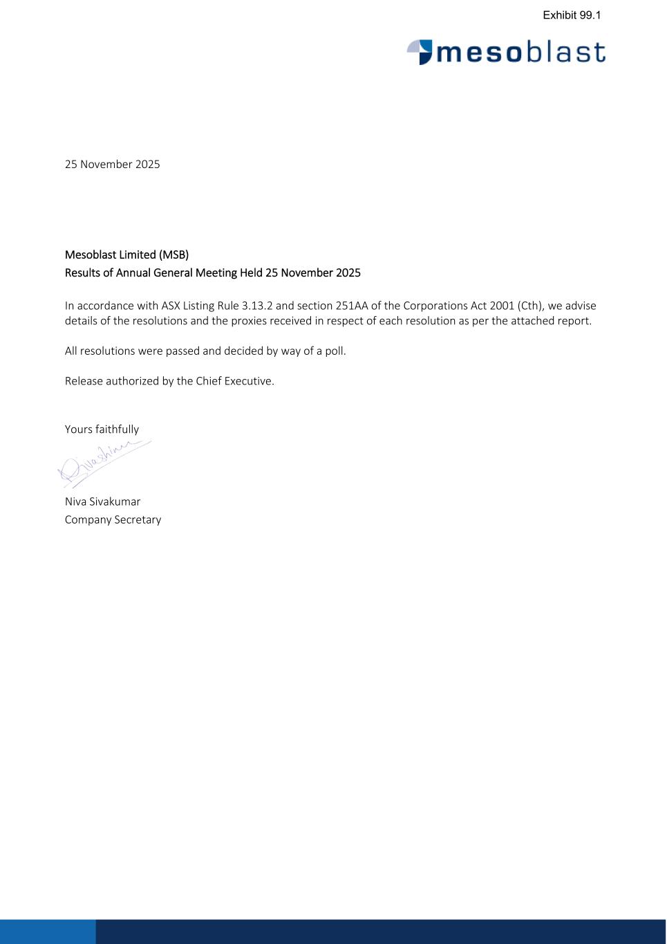 25 November 2025 Mesoblast Limited (MSB) Results of Annual General Meeting Held 25 November 2025 In accordance with ASX Listing Rule 3.13.2 and section 251AA of the Corporations Act 2001 (Cth), we advise details of the resolutions and the proxies received in respect of each resolution as per the attached report. All resolutions were passed and decided by way of a poll. Release authorized by the Chief Executive. Yours faithfully Niva Sivakumar Company Secretary