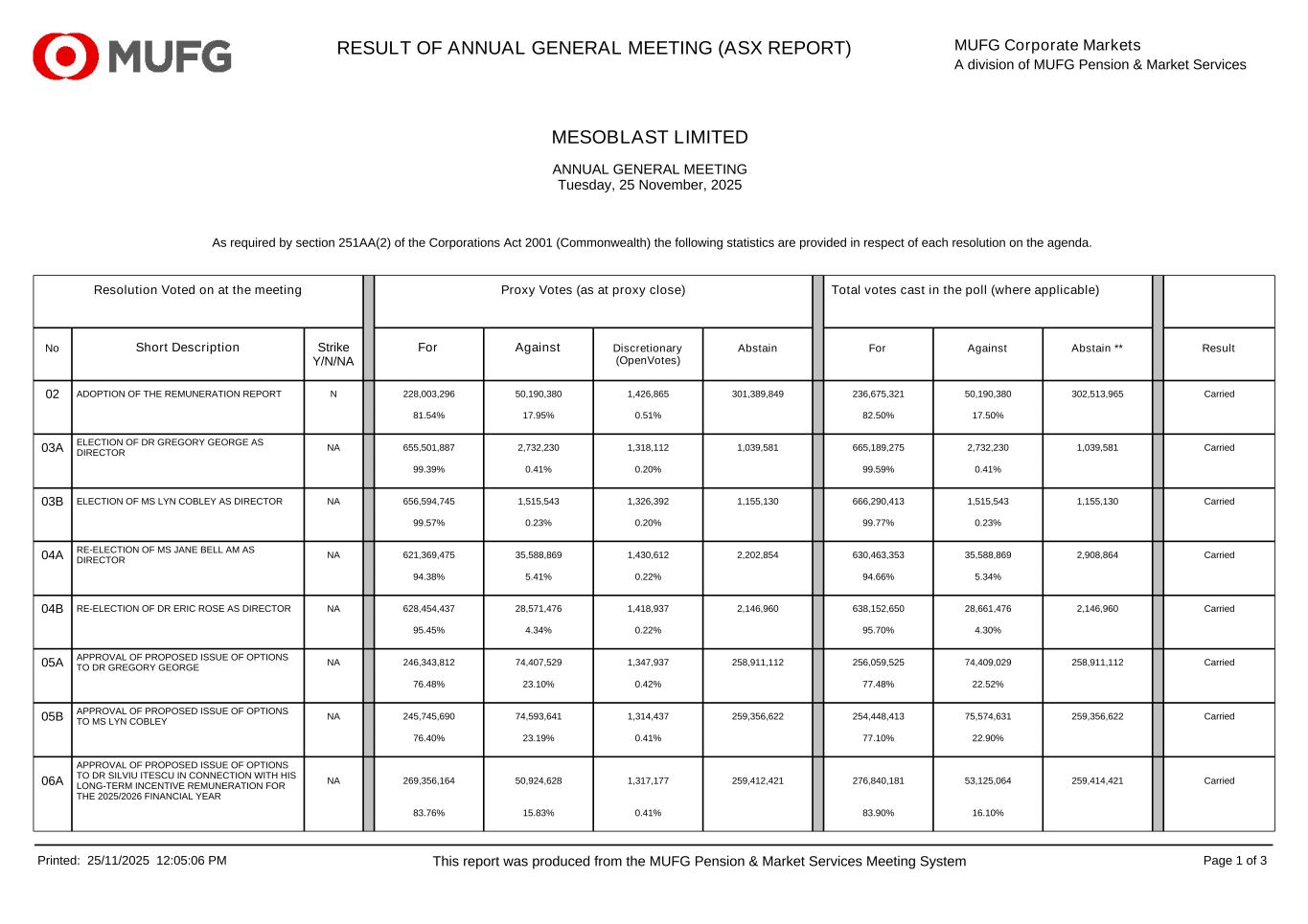 MESOBLAST LIMITED ANNUAL GENERAL MEETING Tuesday, 25 November, 2025 RESULT OF ANNUAL GENERAL MEETING (ASX REPORT) MUFG Corporate Markets A division of MUFG Pension & Market Services As required by section 251AA(2) of the Corporations Act 2001 (Commonwealth) the following statistics are provided in respect of each resolution on the agenda. Resolution Voted on at the meeting Proxy Votes (as at proxy close) Total votes cast in the poll (where applicable) No Short Description Strike Y/N/NA For Against Discretionary (OpenVotes) Abstain For Against Abstain ** Result 02 ADOPTION OF THE REMUNERATION REPORT N 228,003,296 50,190,380 1,426,865 301,389,849 236,675,321 50,190,380 302,513,965 Carried 81.54% 17.95% 0.51% 82.50% 17.50% 03A ELECTION OF DR GREGORY GEORGE AS DIRECTOR NA 655,501,887 2,732,230 1,318,112 1,039,581 665,189,275 2,732,230 1,039,581 Carried 99.39% 0.41% 0.20% 99.59% 0.41% 03B ELECTION OF MS LYN COBLEY AS DIRECTOR NA 656,594,745 1,515,543 1,326,392 1,155,130 666,290,413 1,515,543 1,155,130 Carried 99.57% 0.23% 0.20% 99.77% 0.23% 04A RE-ELECTION OF MS JANE BELL AM AS DIRECTOR NA 621,369,475 35,588,869 1,430,612 2,202,854 630,463,353 35,588,869 2,908,864 Carried 94.38% 5.41% 0.22% 94.66% 5.34% 04B RE-ELECTION OF DR ERIC ROSE AS DIRECTOR NA 628,454,437 28,571,476 1,418,937 2,146,960 638,152,650 28,661,476 2,146,960 Carried 95.45% 4.34% 0.22% 95.70% 4.30% 05A APPROVAL OF PROPOSED ISSUE OF OPTIONS TO DR GREGORY GEORGE NA 246,343,812 74,407,529 1,347,937 258,911,112 256,059,525 74,409,029 258,911,112 Carried 76.48% 23.10% 0.42% 77.48% 22.52% 05B APPROVAL OF PROPOSED ISSUE OF OPTIONS TO MS LYN COBLEY NA 245,745,690 74,593,641 1,314,437 259,356,622 254,448,413 75,574,631 259,356,622 Carried 76.40% 23.19% 0.41% 77.10% 22.90% 06A APPROVAL OF PROPOSED ISSUE OF OPTIONS TO DR SILVIU ITESCU IN CONNECTION WITH HIS LONG-TERM INCENTIVE REMUNERATION FOR THE 2025/2026 FINANCIAL YEAR NA 269,356,164 50,924,628 1,317,177 259,412,421 276,840,181 53,125,064 259,414,421 Carried 83.76% 15.83% 0.41% 83.90% 16.10% Printed: 25/11/2025 12:05:06 PM This report was produced from the MUFG Pension & Market Services Meeting System Page 1 of 3