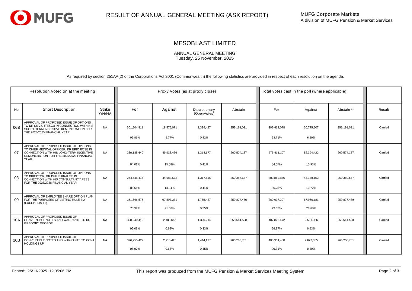 MESOBLAST LIMITED ANNUAL GENERAL MEETING Tuesday, 25 November, 2025 RESULT OF ANNUAL GENERAL MEETING (ASX REPORT) MUFG Corporate Markets A division of MUFG Pension & Market Services As required by section 251AA(2) of the Corporations Act 2001 (Commonwealth) the following statistics are provided in respect of each resolution on the agenda. Resolution Voted on at the meeting Proxy Votes (as at proxy close) Total votes cast in the poll (where applicable) No Short Description Strike Y/N/NA For Against Discretionary (OpenVotes) Abstain For Against Abstain ** Result 06B APPROVAL OF PROPOSED ISSUE OF OPTIONS TO DR SILVIU ITESCU IN CONNECTION WITH HIS SHORT-TERM INCENTIVE REMUNERATION FOR THE 2024/2025 FINANCIAL YEAR NA 301,904,811 18,575,071 1,339,427 259,191,081 309,413,078 20,775,507 259,191,081 Carried 93.81% 5.77% 0.42% 93.71% 6.29% 07 APPROVAL OF PROPOSED ISSUE OF OPTIONS TO CHIEF MEDICAL OFFICER, DR ERIC ROSE IN CONNECTION WITH HIS LONG-TERM INCENTIVE REMUNERATION FOR THE 2025/2026 FINANCIAL YEAR NA 269,185,640 49,936,436 1,314,177 260,574,137 276,411,107 52,394,422 260,574,137 Carried 84.01% 15.58% 0.41% 84.07% 15.93% 08 APPROVAL OF PROPOSED ISSUE OF OPTIONS TO DIRECTOR, DR PHILIP KRAUSE IN CONNECTION WITH HIS CONSULTANCY FEES FOR THE 2025/2026 FINANCIAL YEAR NA 274,646,416 44,688,672 1,317,645 260,357,657 283,869,856 45,150,153 260,359,657 Carried 85.65% 13.94% 0.41% 86.28% 13.72% 09 APPROVAL OF EMPLOYEE SHARE OPTION PLAN FOR THE PURPOSES OF LISTING RULE 7.2 (EXCEPTION 13) NA 251,666,575 67,597,371 1,765,437 259,877,479 260,637,297 67,966,181 259,877,479 Carried 78.39% 21.06% 0.55% 79.32% 20.68% 10A APPROVAL OF PROPOSED ISSUE OF CONVERTIBLE NOTES AND WARRANTS TO DR GREGORY GEORGE NA 398,240,412 2,483,656 1,326,214 258,541,528 407,828,472 2,591,086 258,541,528 Carried 99.05% 0.62% 0.33% 99.37% 0.63% 10B APPROVAL OF PROPOSED ISSUE OF CONVERTIBLE NOTES AND WARRANTS TO COVA HOLDINGS LP NA 396,255,427 2,715,425 1,414,177 260,206,781 405,931,450 2,822,855 260,206,781 Carried 98.97% 0.68% 0.35% 99.31% 0.69% Printed: 25/11/2025 12:05:06 PM This report was produced from the MUFG Pension & Market Services Meeting System Page 2 of 3