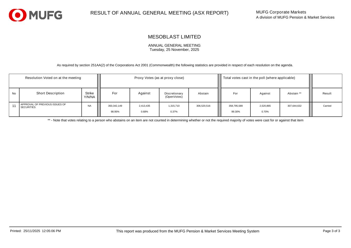 MESOBLAST LIMITED ANNUAL GENERAL MEETING Tuesday, 25 November, 2025 RESULT OF ANNUAL GENERAL MEETING (ASX REPORT) MUFG Corporate Markets A division of MUFG Pension & Market Services As required by section 251AA(2) of the Corporations Act 2001 (Commonwealth) the following statistics are provided in respect of each resolution on the agenda. Resolution Voted on at the meeting Proxy Votes (as at proxy close) Total votes cast in the poll (where applicable) No Short Description Strike Y/N/NA For Against Discretionary (OpenVotes) Abstain For Against Abstain ** Result 11 APPROVAL OF PREVIOUS ISSUES OF SECURITIES NA 350,342,149 2,413,435 1,315,710 306,520,516 358,795,589 2,520,865 307,644,632 Carried 98.95% 0.68% 0.37% 99.30% 0.70% ** - Note that votes relating to a person who abstains on an item are not counted in determining whether or not the required majority of votes were cast for or against that item Printed: 25/11/2025 12:05:06 PM This report was produced from the MUFG Pension & Market Services Meeting System Page 3 of 3