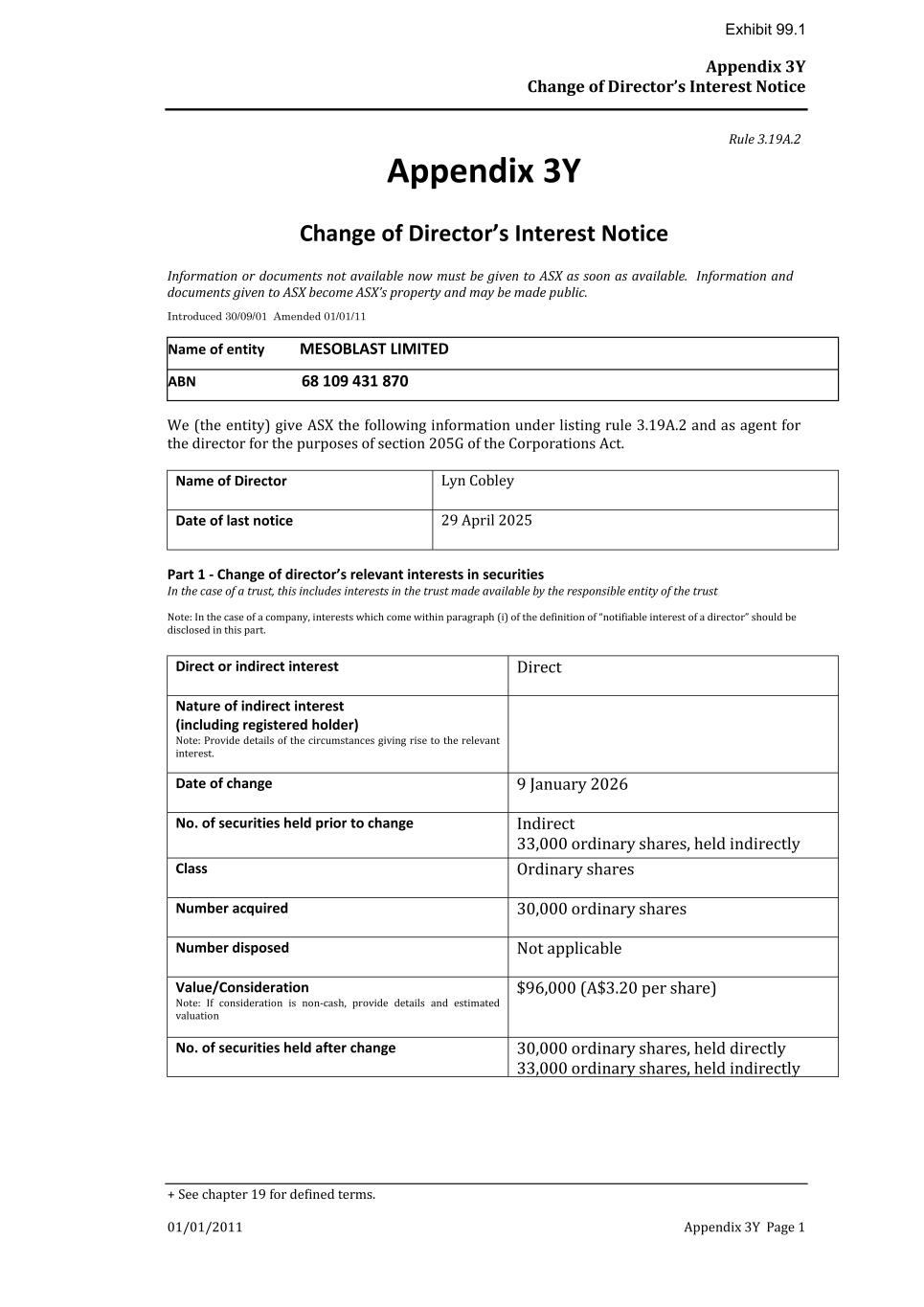 Appendix 3Y Change of Director’s Interest Notice + See chapter 19 for defined terms. 01/01/2011 Appendix 3Y Page 1 Rule 3.19A.2 Appendix 3Y Change of Director’s Interest Notice Information or documents not available now must be given to ASX as soon as available. Information and documents given to ASX become ASX’s property and may be made public. Introduced 30/09/01 Amended 01/01/11 Name of entity MESOBLAST LIMITED ABN 68 109 431 870 We (the entity) give ASX the following information under listing rule 3.19A.2 and as agent for the director for the purposes of section 205G of the Corporations Act. Name of Director Lyn Cobley Date of last notice 29 April 2025 Part 1 - Change of director’s relevant interests in securities In the case of a trust, this includes interests in the trust made available by the responsible entity of the trust Note: In the case of a company, interests which come within paragraph (i) of the definition of “notifiable interest of a director” should be disclosed in this part. Direct or indirect interest Direct Nature of indirect interest (including registered holder) Note: Provide details of the circumstances giving rise to the relevant interest. Date of change 9 January 2026 No. of securities held prior to change Indirect 33,000 ordinary shares, held indirectly Class Ordinary shares Number acquired 30,000 ordinary shares Number disposed Not applicable Value/Consideration Note: If consideration is non-cash, provide details and estimated valuation $96,000 (A$3.20 per share) No. of securities held after change 30,000 ordinary shares, held directly 33,000 ordinary shares, held indirectly