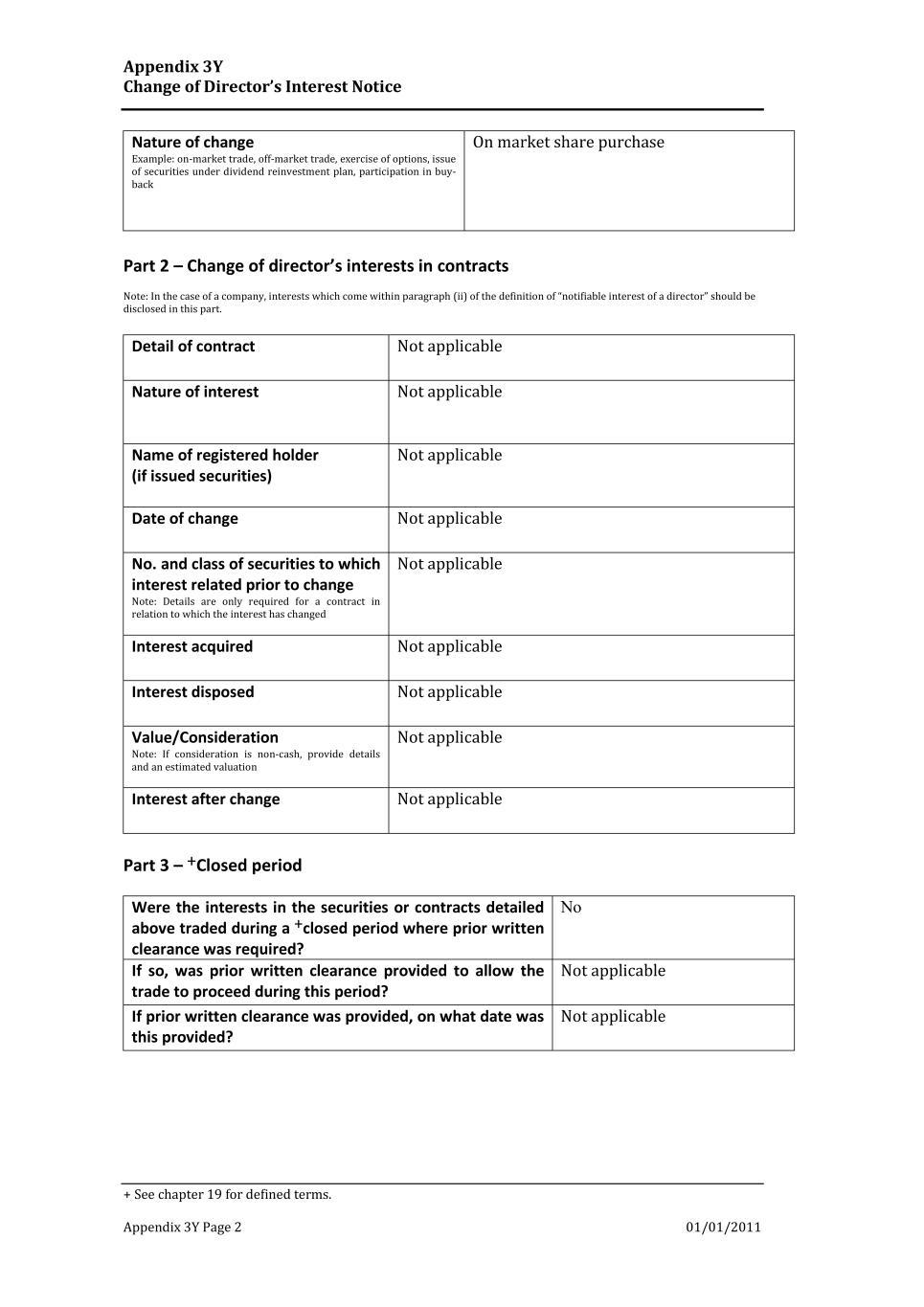 Appendix 3Y Change of Director’s Interest Notice + See chapter 19 for defined terms. Appendix 3Y Page 2 01/01/2011 Nature of change Example: on-market trade, off-market trade, exercise of options, issue of securities under dividend reinvestment plan, participation in buy- back On market share purchase Part 2 – Change of director’s interests in contracts Note: In the case of a company, interests which come within paragraph (ii) of the definition of “notifiable interest of a director” should be disclosed in this part. Detail of contract Not applicable Nature of interest Not applicable Name of registered holder (if issued securities) Not applicable Date of change Not applicable No. and class of securities to which interest related prior to change Note: Details are only required for a contract in relation to which the interest has changed Not applicable Interest acquired Not applicable Interest disposed Not applicable Value/Consideration Note: If consideration is non-cash, provide details and an estimated valuation Not applicable Interest after change Not applicable Part 3 – +Closed period Were the interests in the securities or contracts detailed above traded during a +closed period where prior written clearance was required? No If so, was prior written clearance provided to allow the trade to proceed during this period? Not applicable If prior written clearance was provided, on what date was this provided? Not applicable